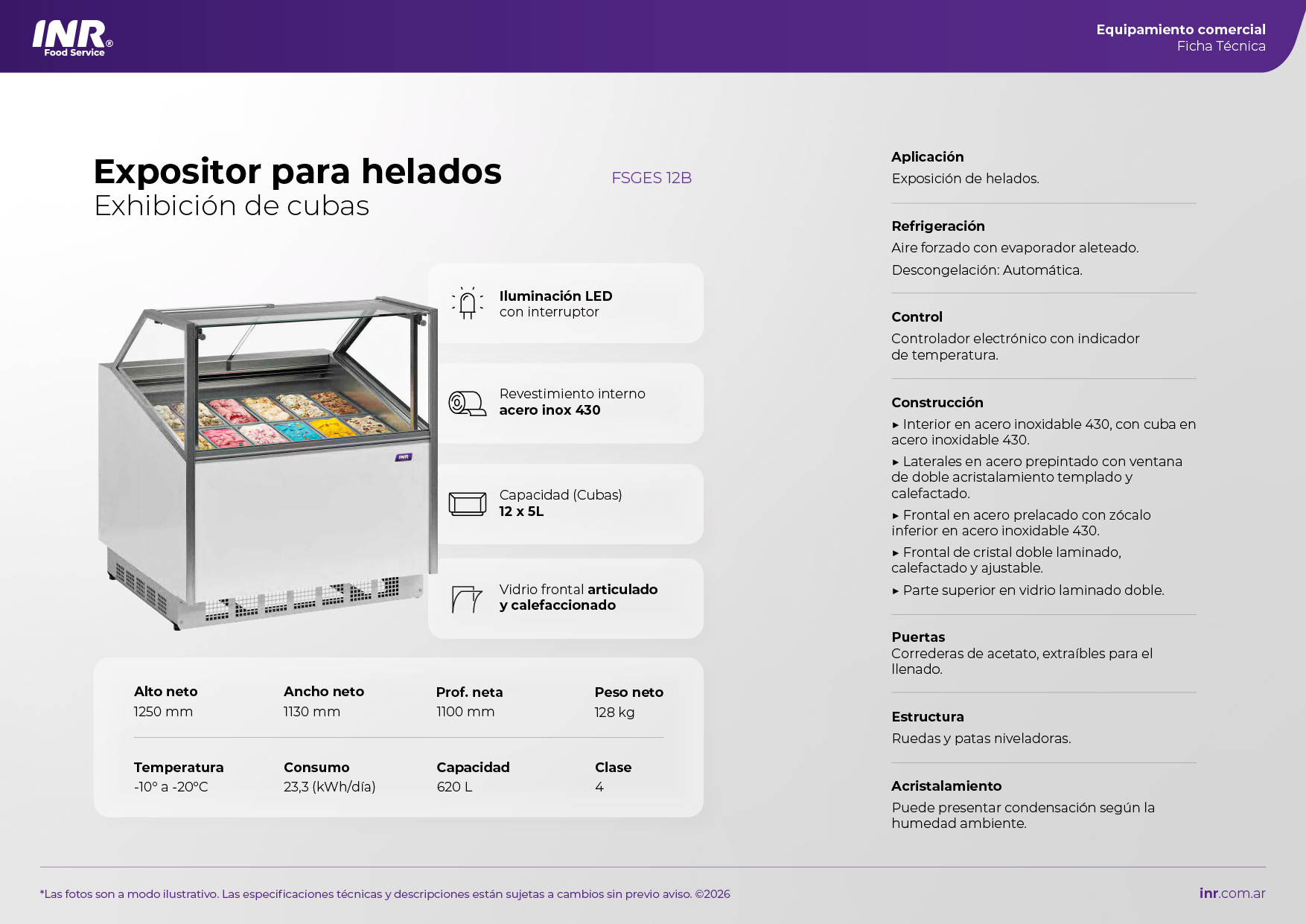 Expositor refrigerado especializado, diseñado para la exhibición y conservación de helado artesanal. Su uso principal es en heladerías, cafeterías y restaurantes, donde mantiene el producto en las condiciones óptimas de temperatura y presentación visual.