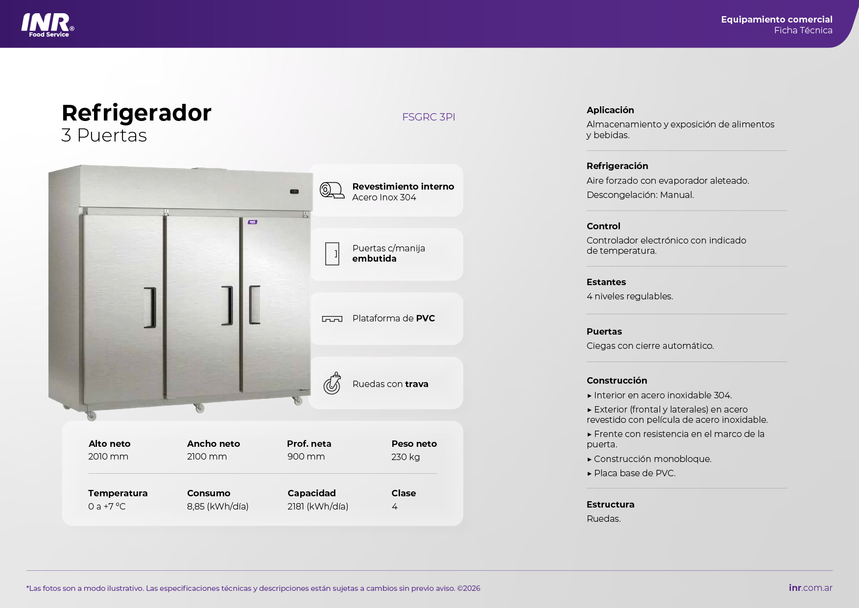 Refrigerador comercial de gran capacidad, diseñado para la conservación eficiente de alimentos y bebidas en entornos de trabajo exigentes. Cuenta con tres puertas independientes que permiten un acceso práctico y ordenado, reduciendo la pérdida de frío durante la operación. Su interior totalmente construido en acero inoxidable garantiza máxima higiene, durabilidad y fácil limpieza, ideal para cumplir con las exigencias sanitarias. Incorpora sistema de refrigeración potente y uniforme, que mantiene una temperatura estable en todo el gabinete.