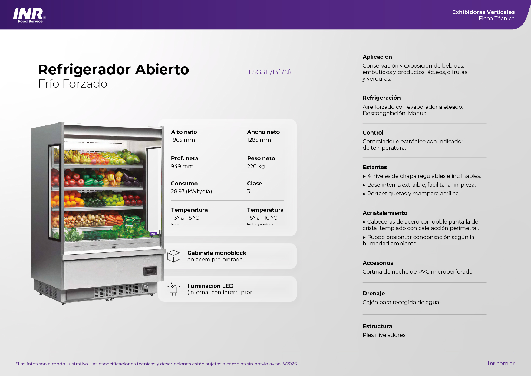 Refrigerador vertical abierto diseñado para la exhibición y conservación de productos refrigerados de alta rotación, permitiendo un acceso rápido y continuo por parte del cliente. Ideal para bebidas, lácteos, sandwiches, ensaladas, comidas preparadas y productos frescos. Cuenta con frente abierto con cortina de aire frío, que mantiene la temperatura interna sin necesidad de puertas, y estantes internos regulables para una disposición ordenada y atractiva de la mercadería. Incorpora iluminación LED vertical que realza la visibilidad y presentación de los productos.