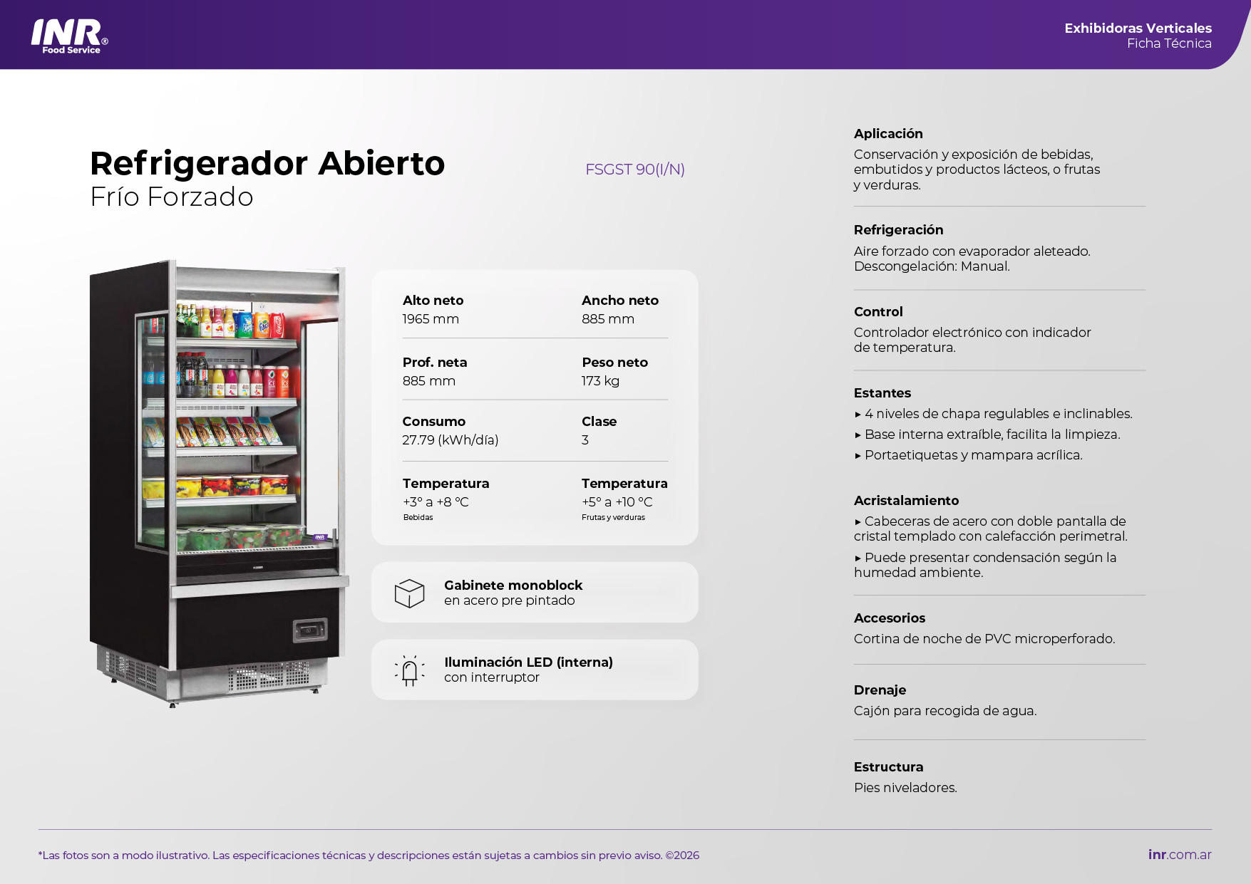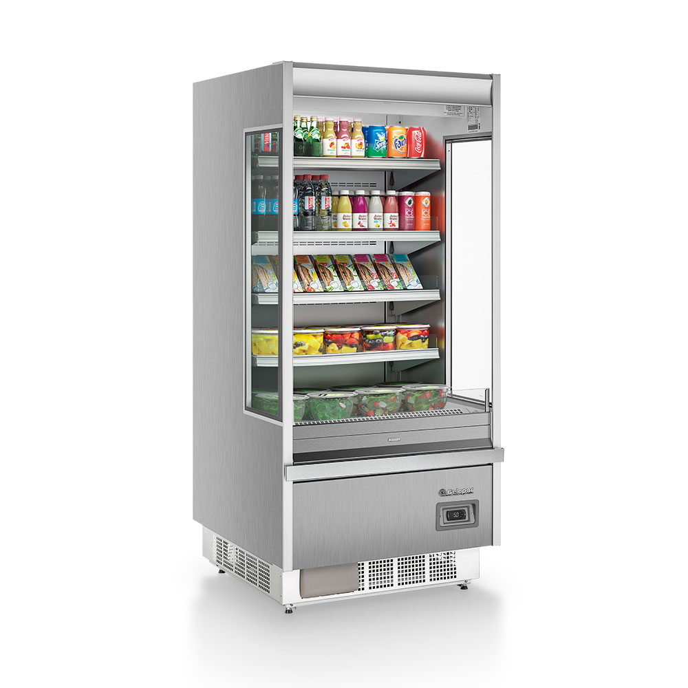 Refrigerador vertical abierto diseñado para la exhibición y conservación de productos refrigerados de alta rotación, permitiendo un acceso rápido y continuo por parte del cliente. Ideal para bebidas, lácteos, sandwiches, ensaladas, comidas preparadas y productos frescos. Cuenta con frente abierto con cortina de aire frío, que mantiene la temperatura interna sin necesidad de puertas, y estantes internos regulables para una disposición ordenada y atractiva de la mercadería. Incorpora iluminación LED vertical que realza la visibilidad y presentación de los productos.
