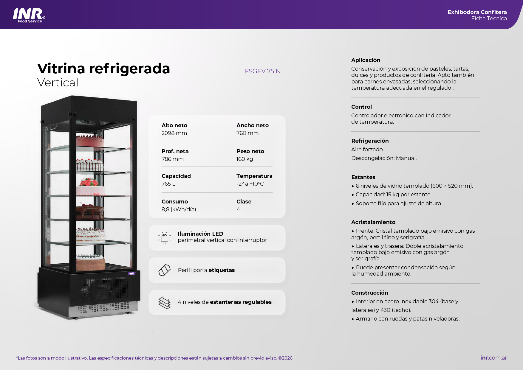 • Temperatura: de -2° a +10°C (recomendada de+3° a 10°C para pasteles)